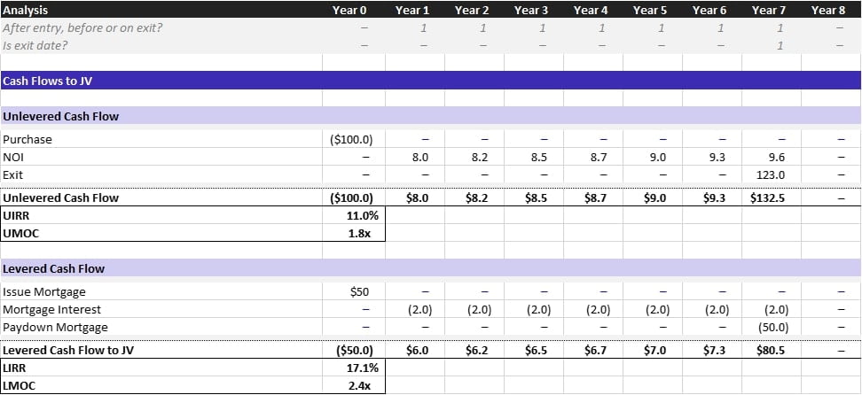 - Exit CF – At exit, the preferred and common equity will split $73.0M, which is the $123M exit value less the $50M mortgage. You can see the hold cash flows in the second post of this series.