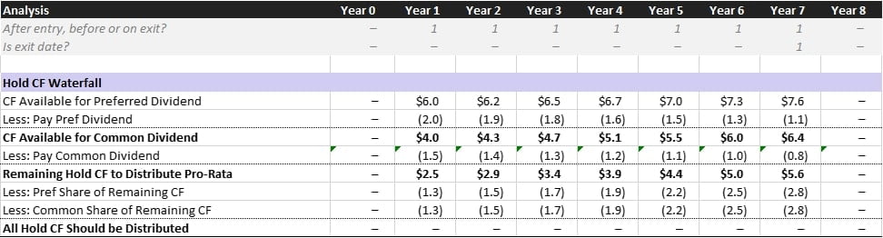 - CF Available for Preferred Dividend – The preferred equity gets first dibs on the hold cash flows for its 8.0% PIK coupon